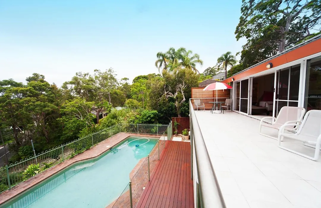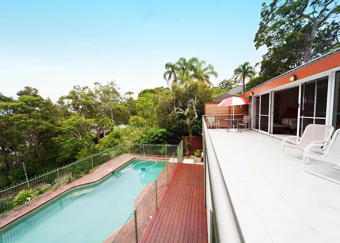De 2-slaapkamer Treetopz Bilgola villa is binnen 2 km afstand van de jachthaven Careel Bay gelegen en biedt een zwembad, wat zorgt voor een ontspannen verblijf.